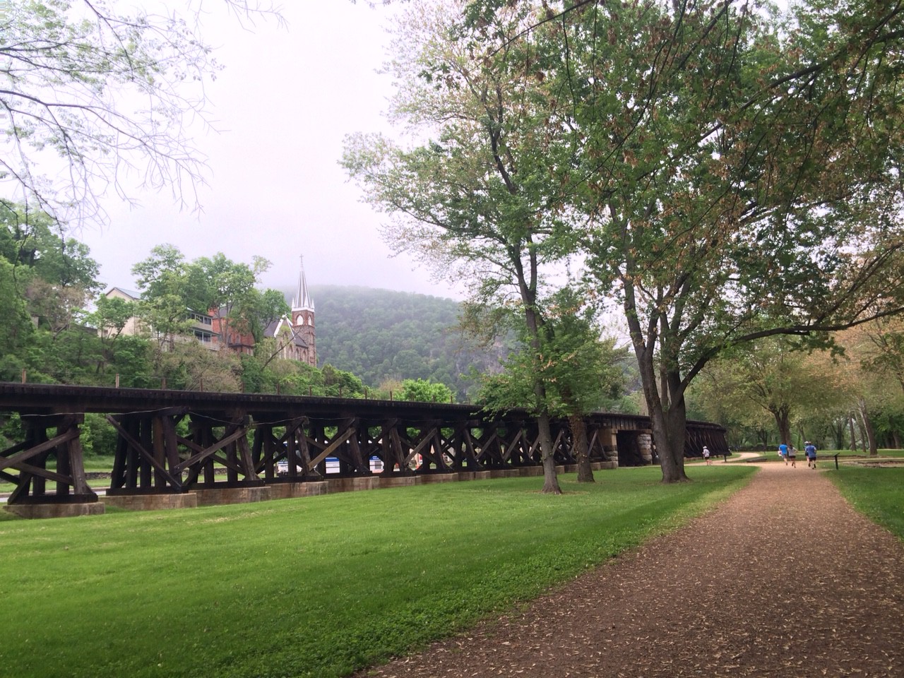 We then headed through the KOA campground on a trail, through a few streets, then down the park road into the lower town of Harpers Ferry–where we began the first really big uphill at the bottom of High Street.
